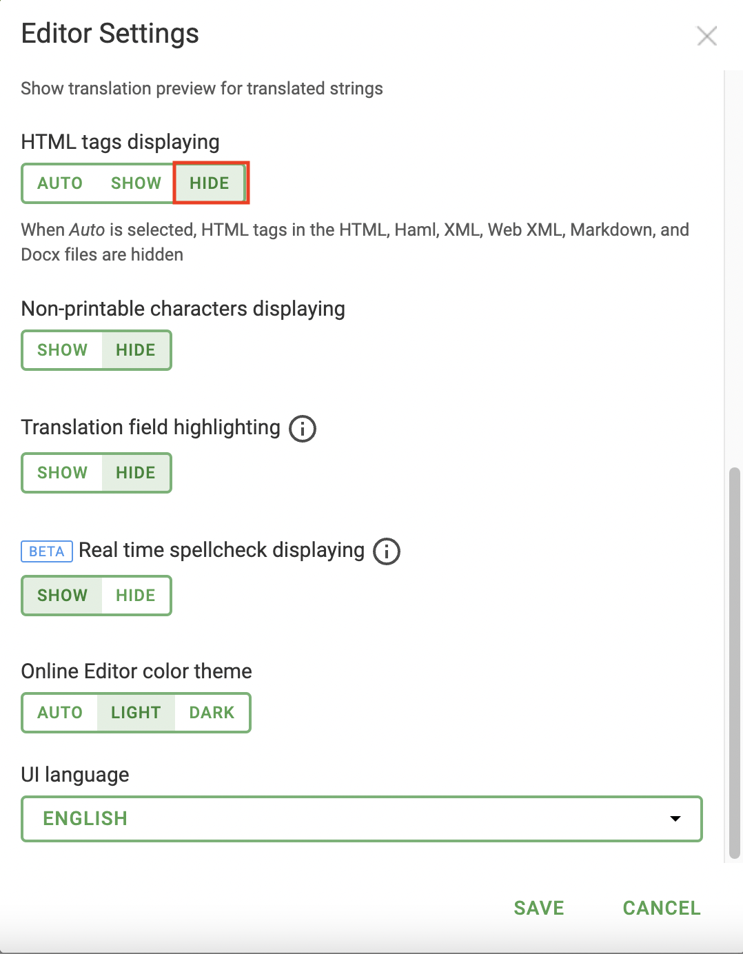 To make it easier to manage tags and copy them directly from the source, we recommend changing your settings in the Crowdin editor.
