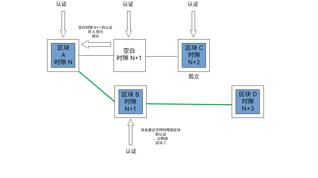 在首次描述低成本单区块重组攻击的同一篇论文中opens in a new tab,也描述了最终确定性延迟(又称为“活性失败”)攻击,这种攻击需要攻击者成为时段边界区块的提议者。 这非常重要,因为这些时段边界区块会成为检查点,以供 Casper 友好最终确定性工具 (FFG) 最终确定区块链的各个部分。 攻击者只需扣留它们的区块,直到足够多的诚实验证者使用它们的友好最终确定性工具 (FFG) 投票支持上一个时段边界区块作为当前最终确定的目标。 然后,攻击者释放扣留的区块。 攻击者证明它们扣留的区块,其余的诚实验证者也这样做,从而创建具有不同目标检查点的分叉。 如果攻击者准确把握时机,就能阻止最终确定性,因为任一分支都无法获得 2/3 绝对多数的证明。 质押越小,就越要精准地把握时机,因为攻击者直接控制的认证会更少,攻击者能够控制提议给定时段边界区块的验证者的几率就越低。